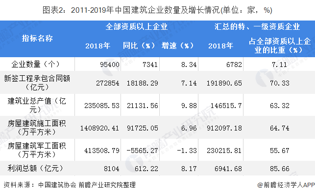 根據(jù)住房和城鄉(xiāng)建設(shè)部匯總的6782個特、一級資質(zhì)建筑業(yè)企業(yè)2018年主要指標數(shù)據(jù)如下表所示。從表中可以看出,上報數(shù)據(jù)的特、一級資質(zhì)企業(yè)數(shù)量占比為7.11%,但新簽工程承包合同額、建筑業(yè)總產(chǎn)值、房屋建筑施工面積、房屋建筑竣工面積和利潤總額5項指標占全部資質(zhì)以上企業(yè)同類指標的比重均超過55%,對行業(yè)發(fā)展的貢獻明顯。