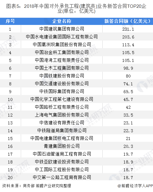 另外,根據(jù)中國商務(wù)部發(fā)布的數(shù)據(jù)顯示,2018年中國對外承包工程(建筑類)業(yè)務(wù)新簽合同額前20家企業(yè)如下表所示,其中中國建筑集團、中國水電建設(shè)國際工程有限公司以及中國葛洲壩集團股份有限公司位列行業(yè)前三,2018年新簽合同額都超過了100億美元。