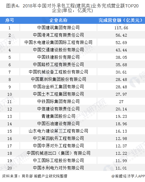 根據(jù)中國商務(wù)部發(fā)布的數(shù)據(jù)顯示,2018年中國對外承包工程(建筑類)業(yè)務(wù)完成營業(yè)額前20家企業(yè)如下表所示,其中中國建筑集團、中國港灣工程集團已經(jīng)中國水電建設(shè)集團位列行業(yè)前三,2018年完成的營業(yè)額都超過了50億美元。